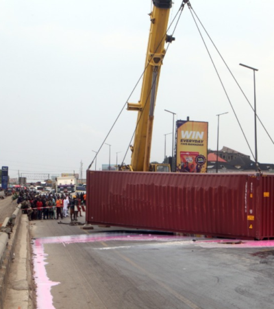 PICTORIAL: Fallen container causes gridlock on Lagos-Ibadan expressway