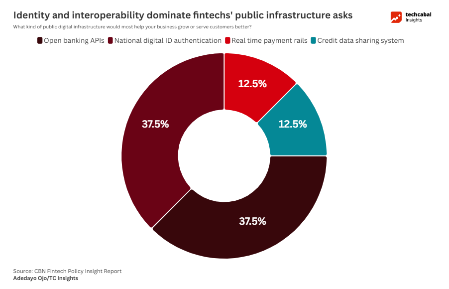 Survey responses highlight where improvements in public digital infrastructure could have the greatest impact. Open banking APIs and national digital ID authentication were each identified by 37.5% of fintech operators as the most important infrastructure enablers.