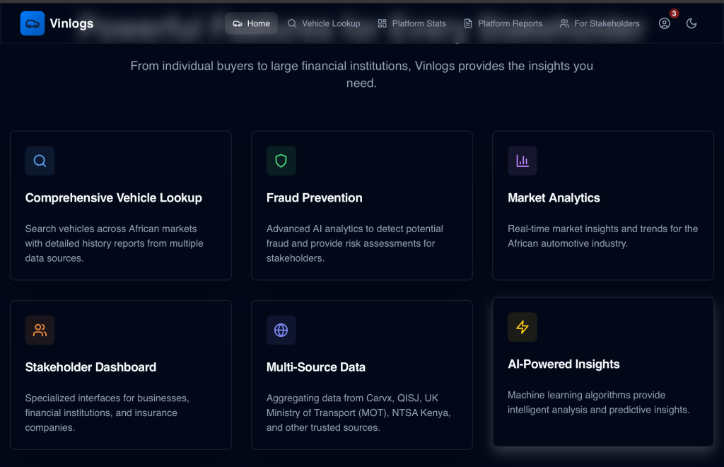 Vinlogs collects data from verified sources, including the UK Ministry of Transport, Quality Inspection Services Japan (QISJ), and the National Transport and Safety Authority (NTSA) in Kenya. It then cross-checks records for consistency and stores them on blockchain infrastructure to prevent tampering. On top of this data layer, Vinlogs applies AI-powered analysis to detect fraud patterns, flag mileage discrepancies, and generate risk scores that support decision-making for buyers, dealerships, banks, and insurers.