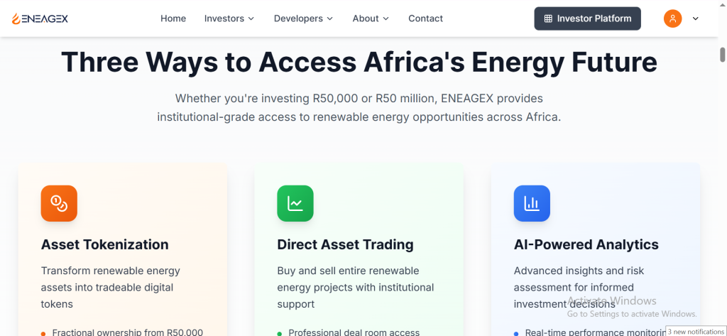 Through its Energy Securities Platform, ENEAGEX enables developers to securitise renewable energy assets and tokenise them using blockchain technology, allowing them to be partially owned and traded. Assets go through assessment and valuation before being tokenised, and then smart contracts will manage the participation of investors, revenue distribution, and secondary market trading. The platform integrates AI-powered tools for real-time performance monitoring, risk assessment, predictive analytics, and asset valuation.