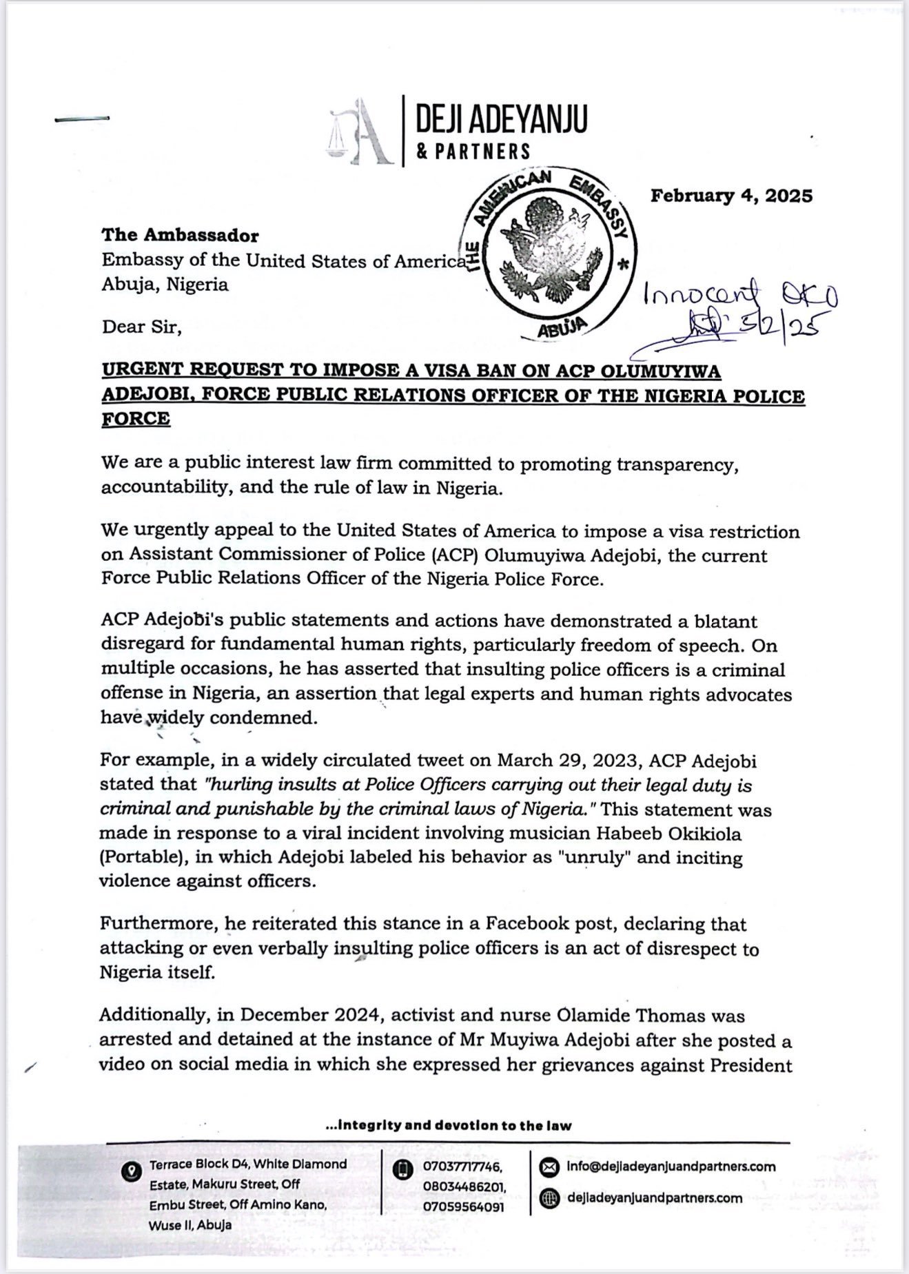 A human rights activist, along with their law firm, has submitted a petition to various countries including the United States, United Kingdom, Canada, and the European Union, urging them to impose a visa ban on the Force Public Relations Officer. The petition, dated February 4, 2025, accuses the officer of stifling free speech and using his authority to intimidate Nigerians critical of the government.