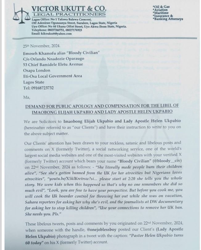 The founder of Liberty Foundation Gospel Ministries is taking legal action against a singer known as Bloody Civilian for alleged defamation, seeking N200 billion in damages. The demand for an apology and compensation was made in a letter dated November 25, 2024. The controversy arose when a social media user posted about the pastor’s birthday, to which Bloody Civilian responded with a controversial claim. This led to a threat of legal action from the pastor’s daughter. The legal counsel described the singer’s comments as reckless and libelous, demanding a public apology and compensation. The letter also mentioned police and DSS investigations that reportedly debunked the claims against the pastor. The demand letter required a written apology and the payment of N200 billion in damages within a week.