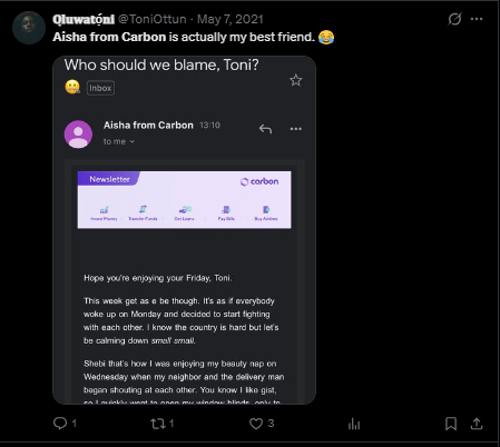She leveraged the neobank’s largest channel, newsletters, humanising fintech for Nigerians across the board with emails by ‘Aisha from Carbon’.