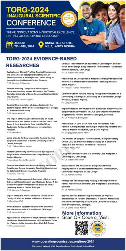 We are thrilled to announce the TORG 2024 Inaugural Scientific Conference, scheduled from August 7th to 9th in the vibrant city of Ikeja, Lagos, Nigeria. This event, organized by The Operating Room Global (TORG)in collaboration with the National Association of Perioperative Nurses of Nigeria (NAPON) National and Nigerian Medical Association (NMA) is CPD accredited, offering a comprehensive educational experience for healthcare professionals. The conference aims to unite operating room experts, healthcare professionals, and scientific enthusiasts from around the world, focusing on innovation, surgery, research, and collaboration. This will be a hub for knowledge exchange, exploration of breakthroughs, and the nurturing of invaluable connections.