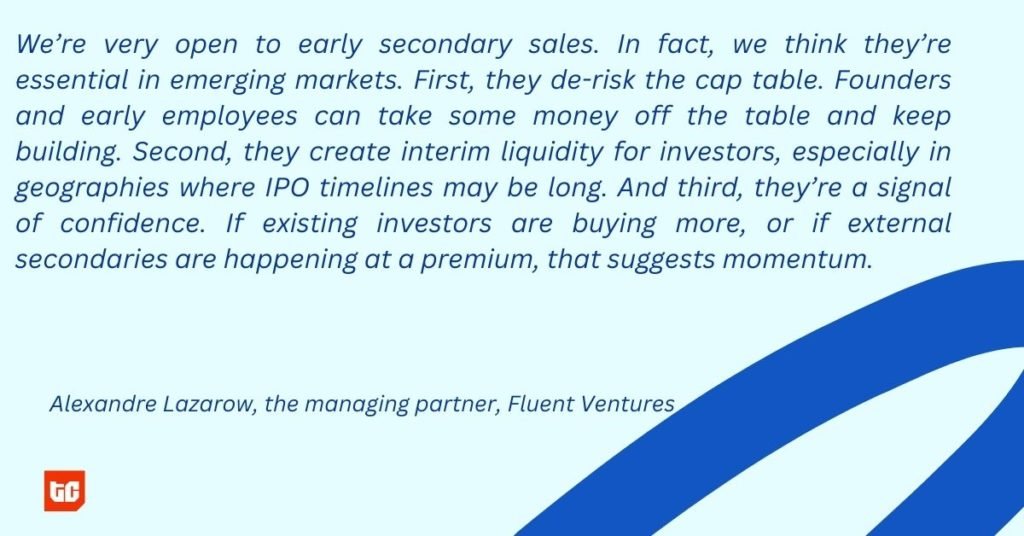 We’re very open to early secondary sales — in fact, we think they’re essential in emerging markets. First, they de-risk the cap table. Founders and early employees can take some money off the table and keep building. Second, they create interim liquidity for investors, especially in geographies where IPO timelines may be long. And third, they’re a signal of confidence. If existing investors are buying more, or if external secondaries are happening at a premium, that suggests momentum.