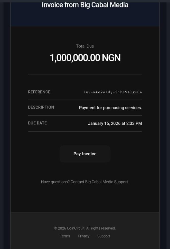 CoinCircuit merchants and even creators can create invoices and send to customers, who can choose to pay in crypto or fiat currencies. Image Source: TechCabal.