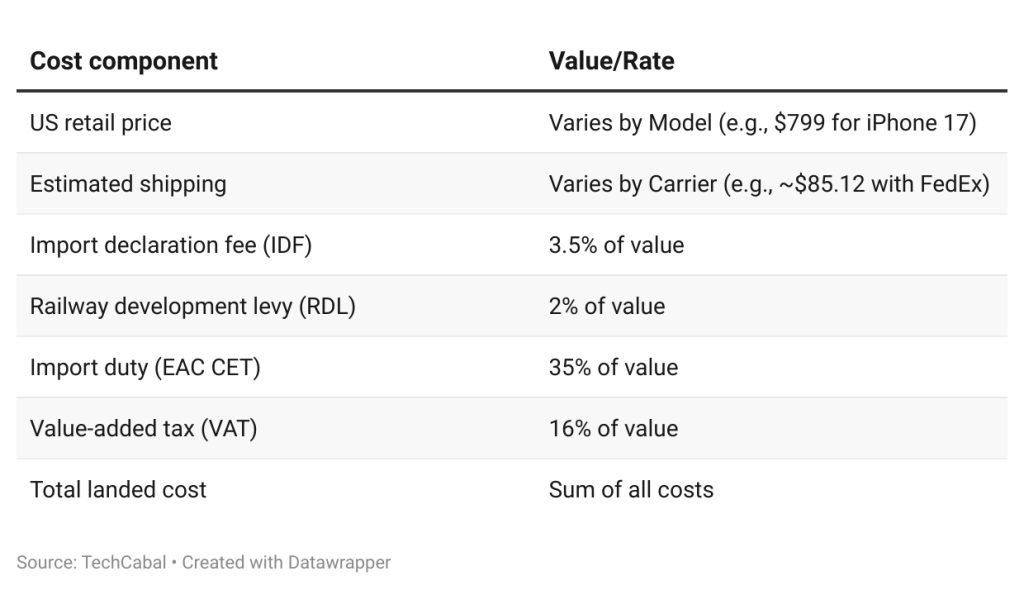Kenya recently changed how it taxes mobile phones, and this directly affects the iPhone 17’s final price. Under the East African Community (EAC) Common External Tariff, the duty on mobile phones was raised to 35% in July 2022. On top of that, you pay: