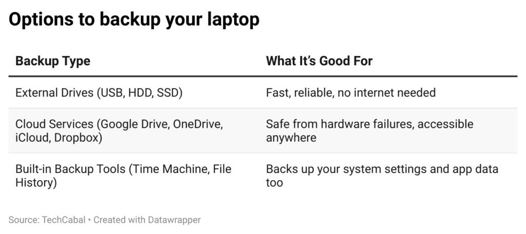 Before formatting, ensure that all your important data is safely backed up. Once you wipe your laptop, there’s no going back. You’ll lose everything: photos, work files, apps, settings, even drivers. Here’s how to cover your bases: