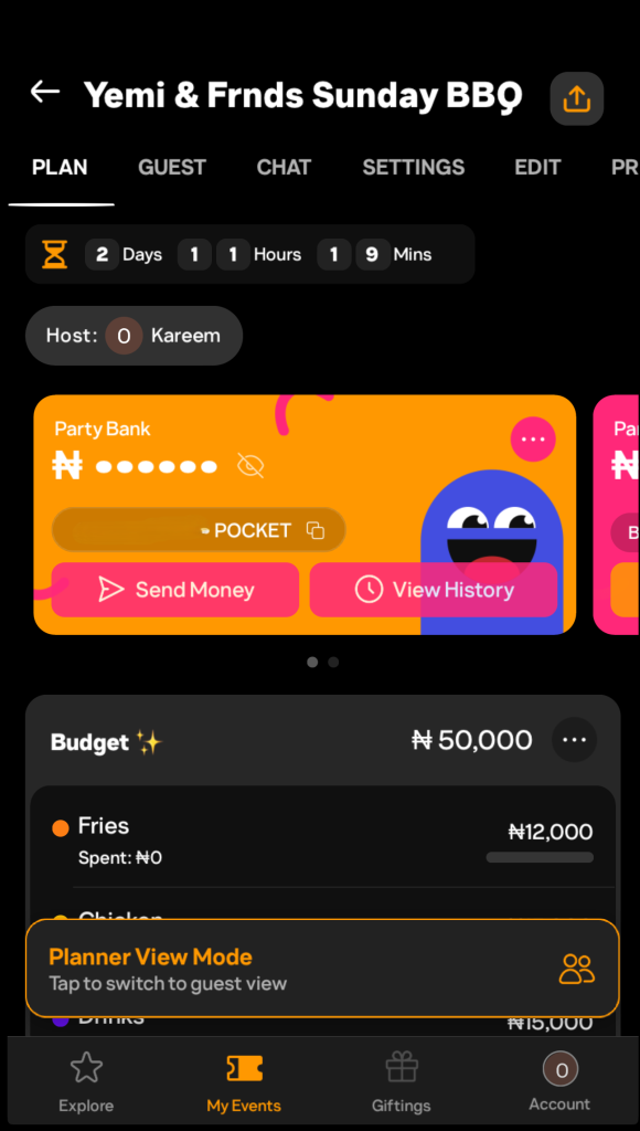 The planner’s dashboard is where PartyVest starts to feel like a genuine planning tool. At the top is a countdown clock showing how long I have before my event starts. Below that is my event wallet, which allowed me to generate a unique bank account number for my barbecue. “That account number is a Pocket App account number that PiggyVest Business APIs provides, ” Joshua Chibueze, co-founder of PiggyVest, noted, adding that the engine powering transfers to vendors is Pocket.