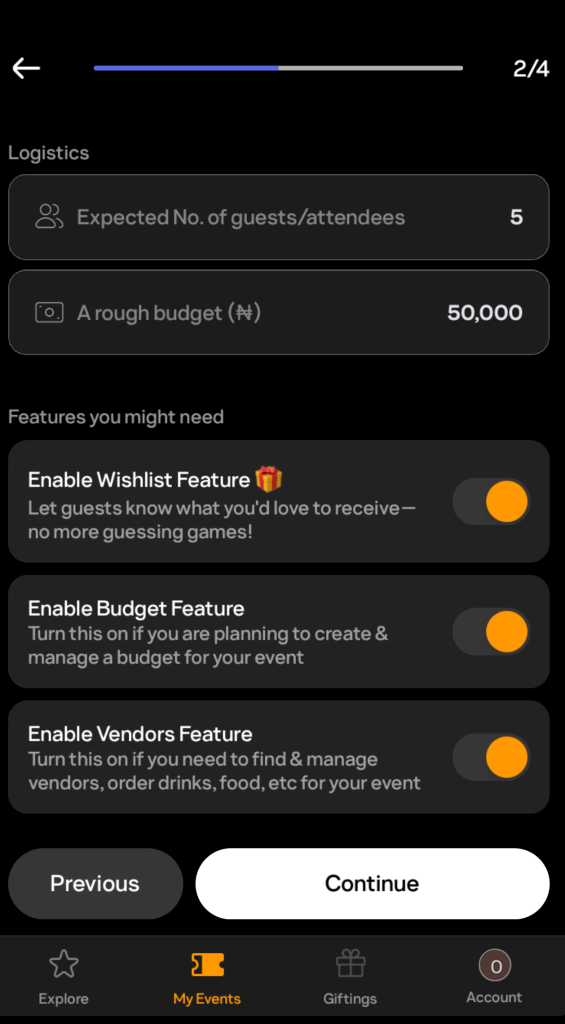 Next, the app asked for basic logistics such as the expected number of guests (I input 5 people), an estimated budget (I settled on ₦50,000 [$34.53]), and whether I wanted extra features like a wishlist that tells attendees what I would like them to bring, a budget tracker to manage expenses, and vendor management. Now, I didn’t strictly need to onboard vendors because it was all going to be DIY barbecue, but I enabled the feature anyway.