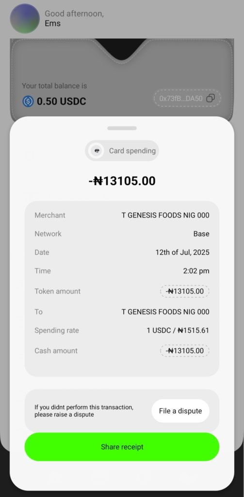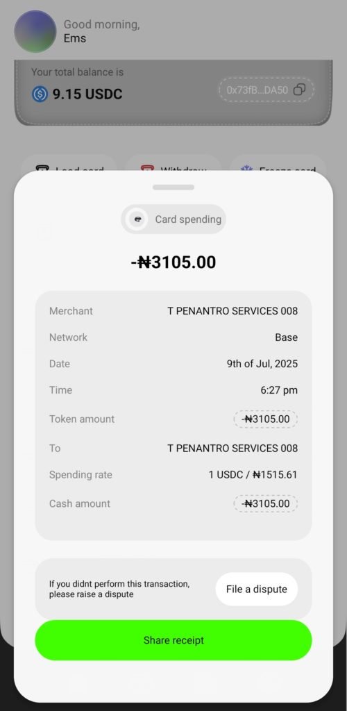 Zerocard doesn’t let you buy crypto directly in the app, so I used Coinbase Wallet, which has a built-in Onboard peer-to-peer (P2P) feature. In February, Coinbase partnered with Nigeria’s Onboard Global to allow users to buy crypto through verified P2P merchants. I started with ₦34,000 ($24.03) and bought just enough USDC to fund my Zerocard wallet.