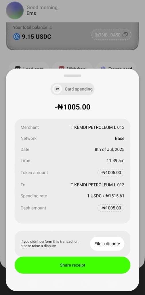 The second revenue stream comes from every transaction that flows through Zerocard’s settlement engine. When a user authorises a payment, Zerocard settles the merchant in naira by converting USDC at a slightly adjusted rate. That spread—typically within 1% of the market rate—is where Zerocard earns.