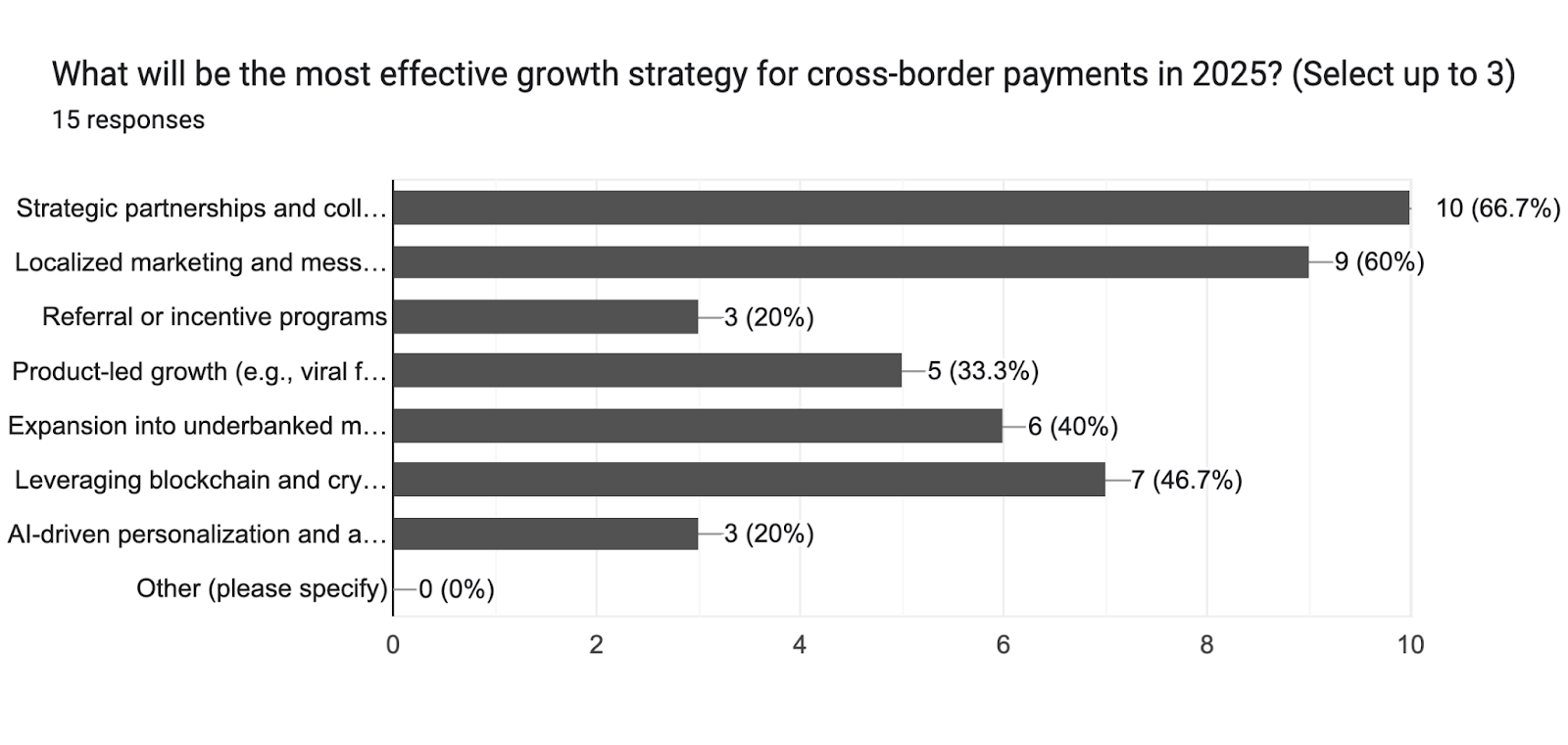 The study conducted on growth strategies for 2025 revealed that partnerships, localized marketing campaigns, and leveraging blockchain technology are key drivers of growth in the cross-border payments sector. These strategies focus on expanding reach, resonating with target audiences, and enhancing the efficiency of payment processes.