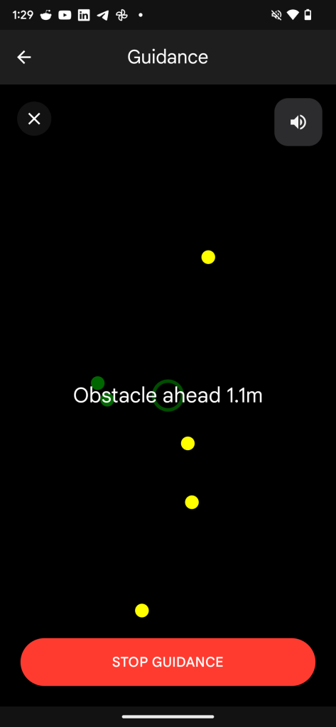 EyeGuide has four core functions, the first and most crucial being navigation. The Android version, instead of using Lidar, uses the device’s AR toolkit (Augmented Reality) and sensor fusion to understand the user’s environment, then measures how far each object is to the user by using onboard sensors such as the gyroscope and magnetometer to track movement, and then translates all these to the user through haptics(vibration) and audio feedback. It continuously scans the surroundings in real time, alerting users to obstacles and even the presence of nearby people.