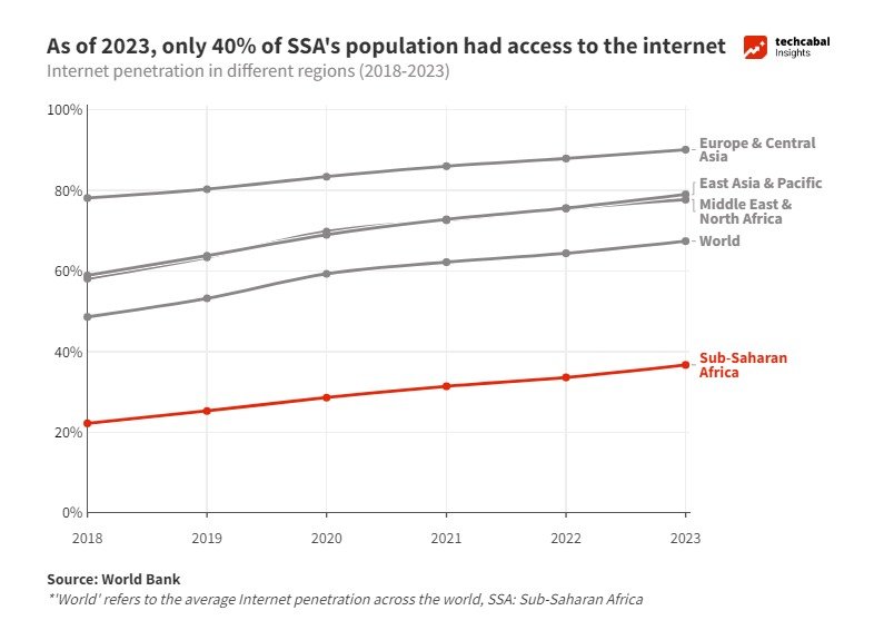 As of 2023, only 40% of SSA’s population had access to the internet. Image | Joseph Seun, TC Insights