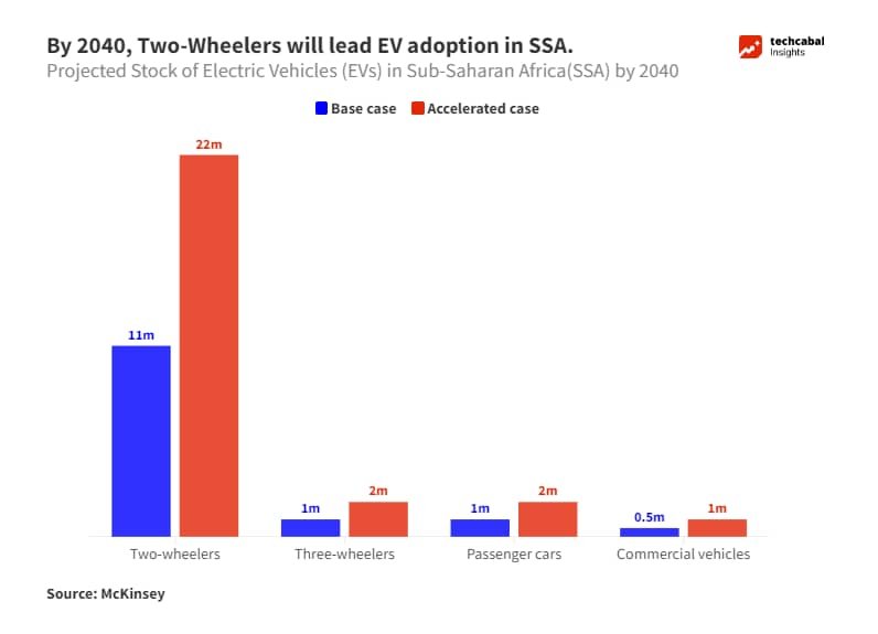 By 2040, two wheelers will lead EV adoption in Sub-Saharan Africa. Chart by Seun Joseph, TC Insights
