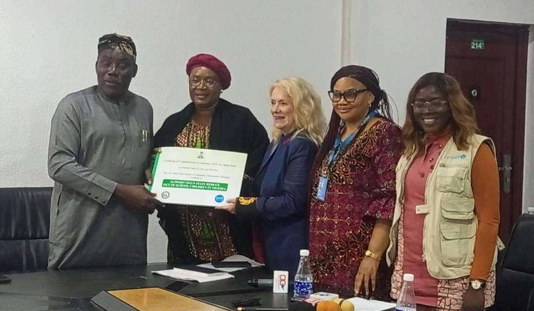 The United Nations Children’s Fund and the Ogun State House of Assembly recently joined forces in a commitment to reduce the number of out-of-school children in the state. The signing of the certificate of commitment took place during a visit by the UNICEF Chief of Lagos Field Office, Mrs Celine Lafoucriere, and her team to the state legislators at the Assembly Complex in Oke-Mosan, Abeokuta.