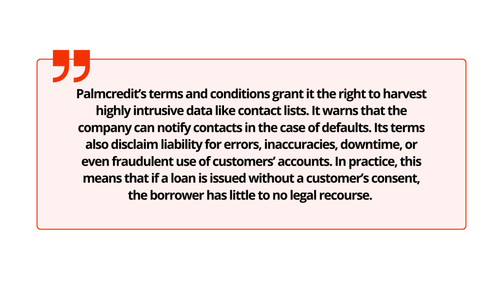 Palmcredit’s terms and conditions grant it the right to harvest highly intrusive data like contact lists. It warns that the company can notify contacts in the case of defaults. Its terms also disclaim liability for errors, inaccuracies, downtime, or even fraudulent use of customers’ accounts. In practice, this means that if a loan is issued without a customer’s consent, the borrower has little to no legal recourse.