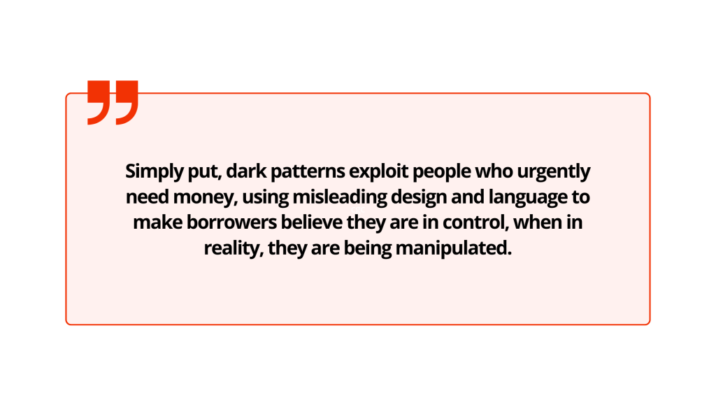 Simply put, dark patterns exploit people who urgently need money, using misleading design and language to make borrowers believe they are in control, when in reality, they are being manipulated.