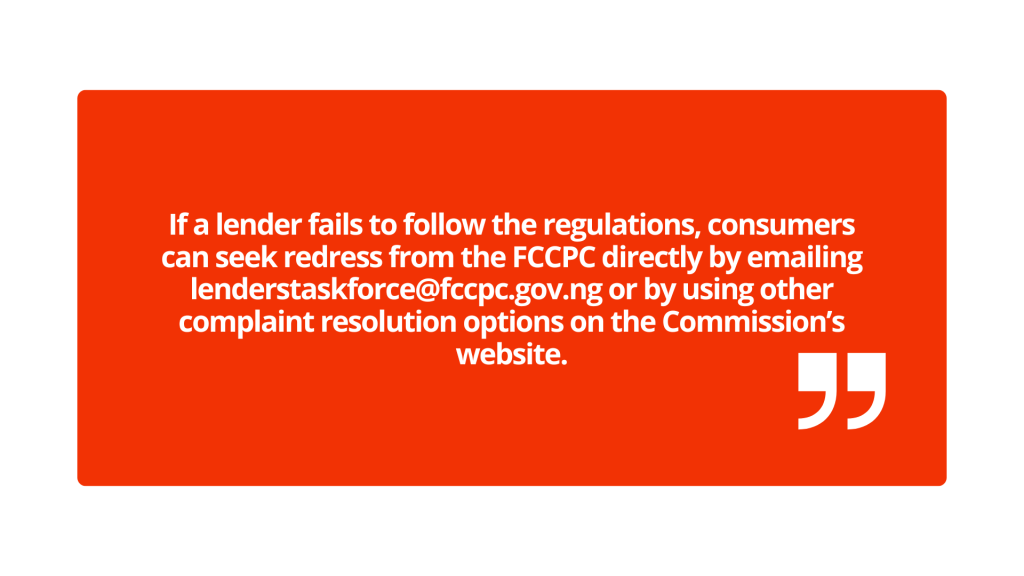 If a lender fails to follow the regulations, consumers can seek redress from the FCCPC directly by emailing lenderstaskforce@fccpc.gov.ng or by using other complaint resolution options on the Commission’s website.