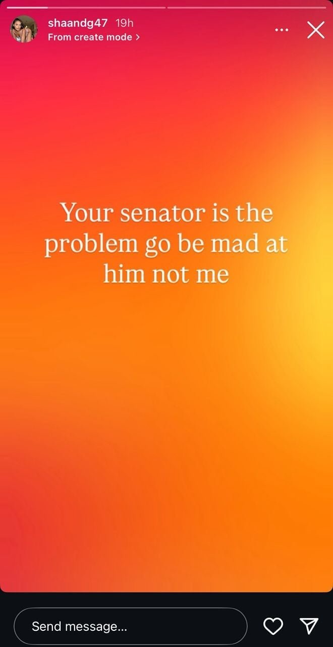 “Your senator is the problem. Go be mad at him not me,” she wrote