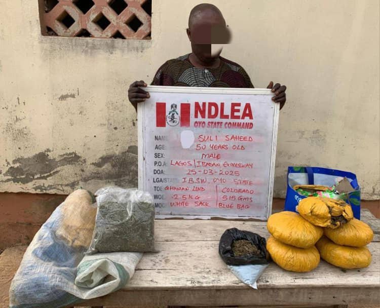 “Another suspect Suli Saheed, 50, was nabbed with 2.5 kilograms of Ghanaian Loud and 515 grams of Colorado, at Olomi Academy area of Ibadan, Oyo state.: