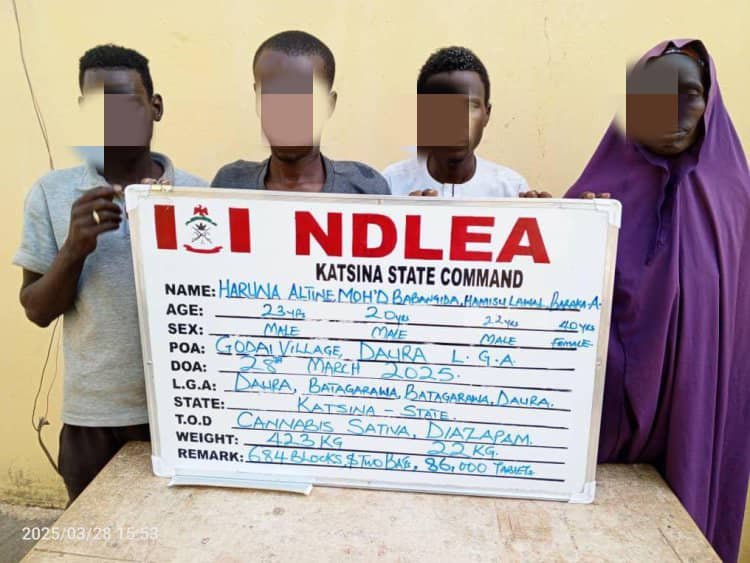 Meanwhile, in Katsina State, NDLEA operatives arrested four suspects, Baraka Abubakar, 40; Haruna Alitine, 23; Muhammad Babangida, 20; and Hamisu Lawal on March 28, 2025, following an intelligence-led raid at Godai village in Daura Local Government Area.