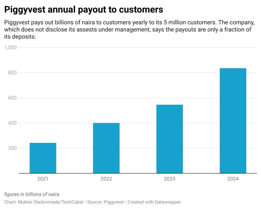 Piggyvest, a Nigerian savings platform that has been in operation for nine years, made payments totaling ₦835 billion to its customers and surpassed 5 million users in 2024. Since its establishment in 2016, customers have withdrawn over ₦2 trillion, which is a portion of the total deposits held by Piggyvest.