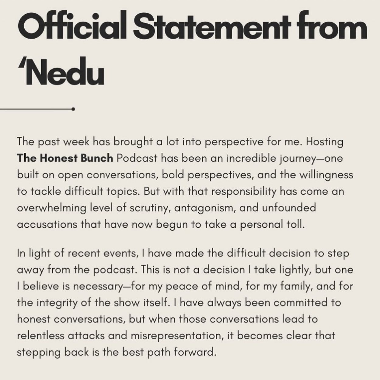 Feeling the pressure of the situation, Nedu announced his departure from the podcast on Instagram, citing the need to safeguard his mental well-being, family, and the show’s integrity. He expressed gratitude for the podcast’s impact but acknowledged that the scrutiny and negativity surrounding recent events had taken a toll on him personally. Nedu emphasized his dedication to meaningful conversations but believed stepping back was necessary to address the ongoing challenges.