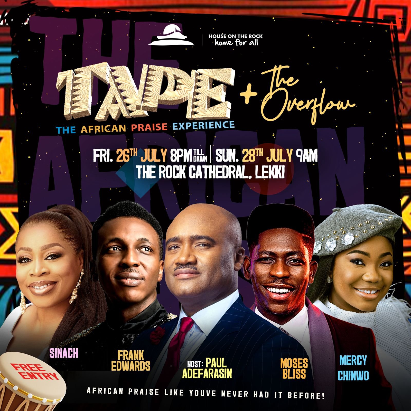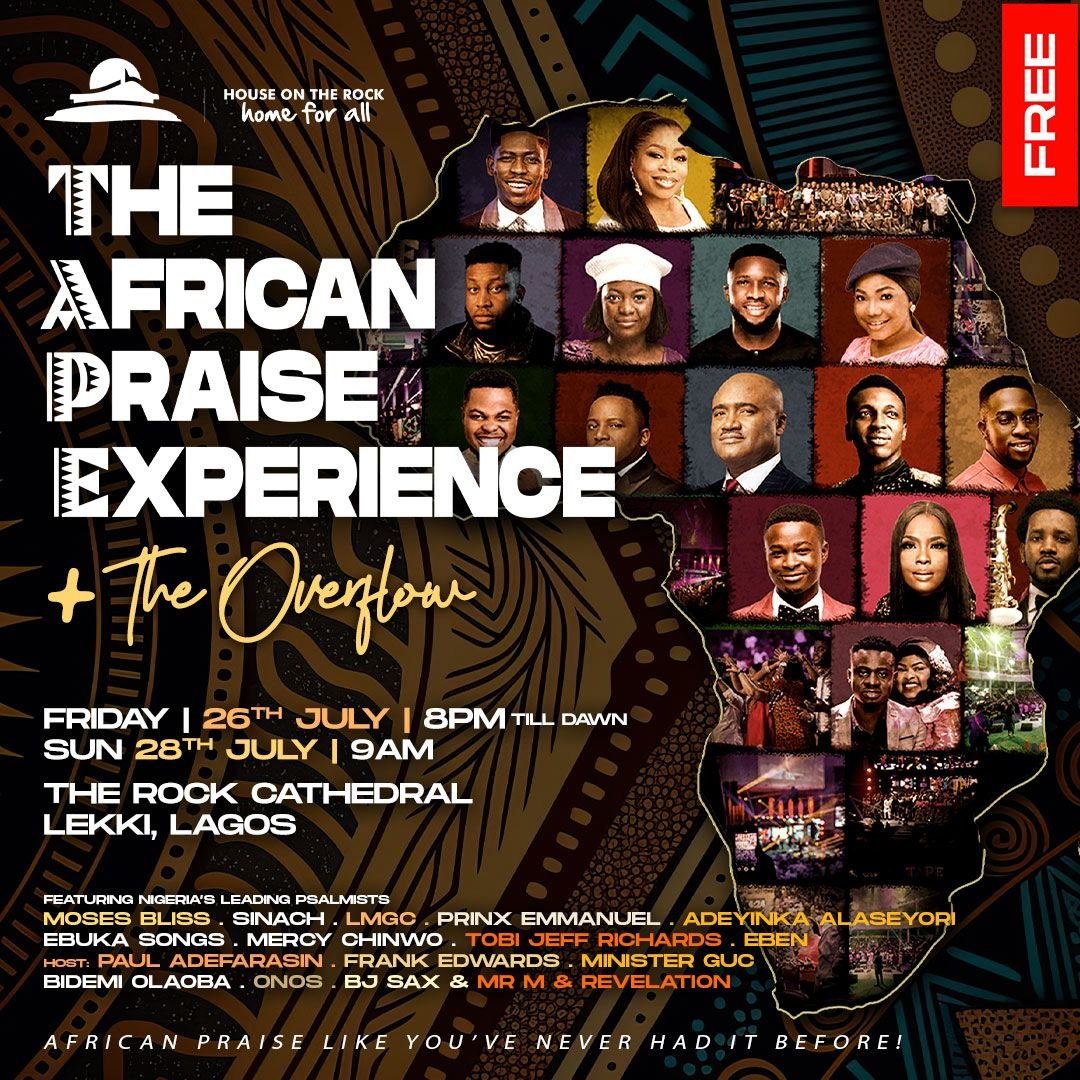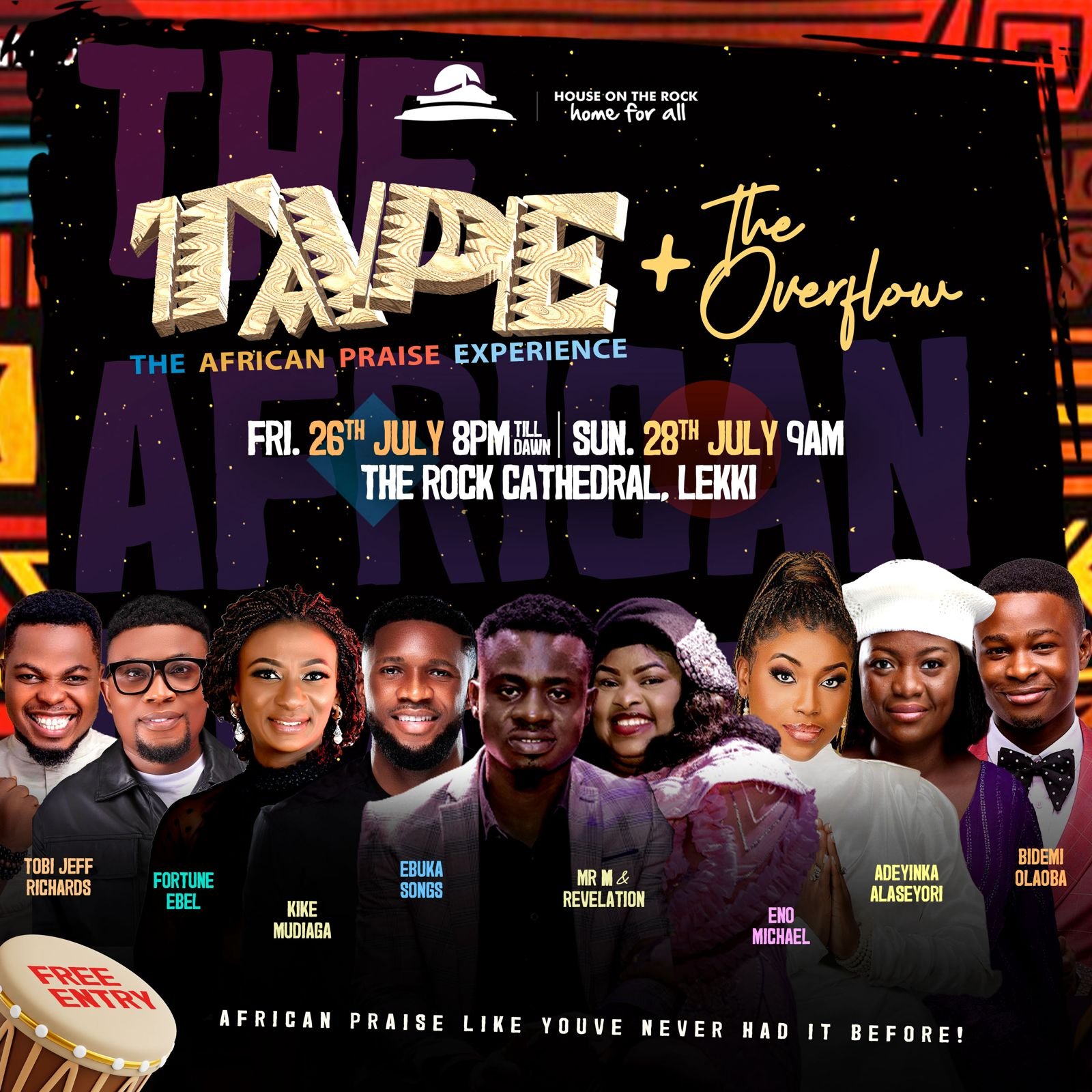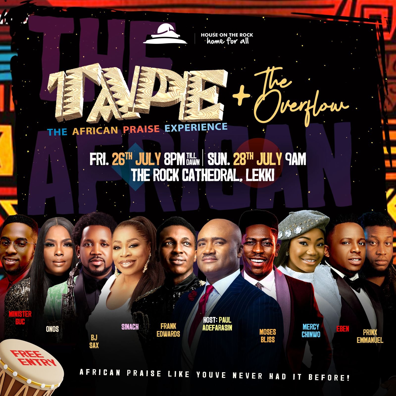 Starting at 8 pm and continuing until dawn, The African Praise Experience (TAPE) will feature life-changing ministrations from a plethora of worship leaders such as Moses Bliss, Sinach, Prinx Emmanuel, Beejay Sax, Onos Ariyo, Adeyinka Alaseyori, Eben, Mr M & Revelation, Mercy Chinwo, Frank Edwards, Bidemi Olaoba, Ebuka Songs, Minister GUC and of course the very dynamic Lagos Metropolitan Gospel Choir (LMGC).
