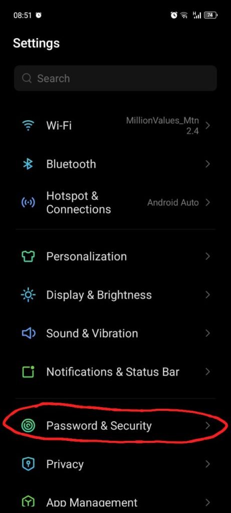 - Look for a section labelled Security, Privacy, Biometrics and Security, or Security and Location.