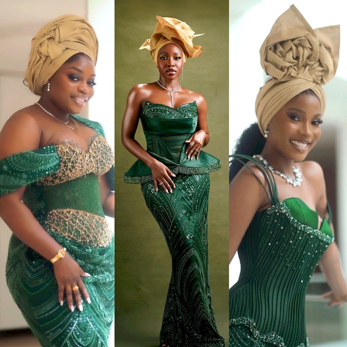 Her Nollywood besties and bridesmaids, including Jemima Osunde, Bisola Aiyeola, and Ini Dima-Okojie, are serving serious squad goals in emerald green. The structured and embellished gowns offer a touch of glamour, while the beige Gele in various styles add a unique twist to their coordinated look.