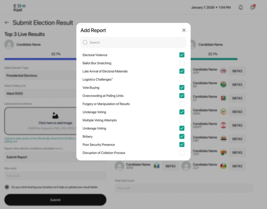 E Don Kast works as a web application that requires no sign-in to upload election results. Anyone present at a polling unit can upload a photo of Form EC8A–the official result sheet–and input the recorded figures.