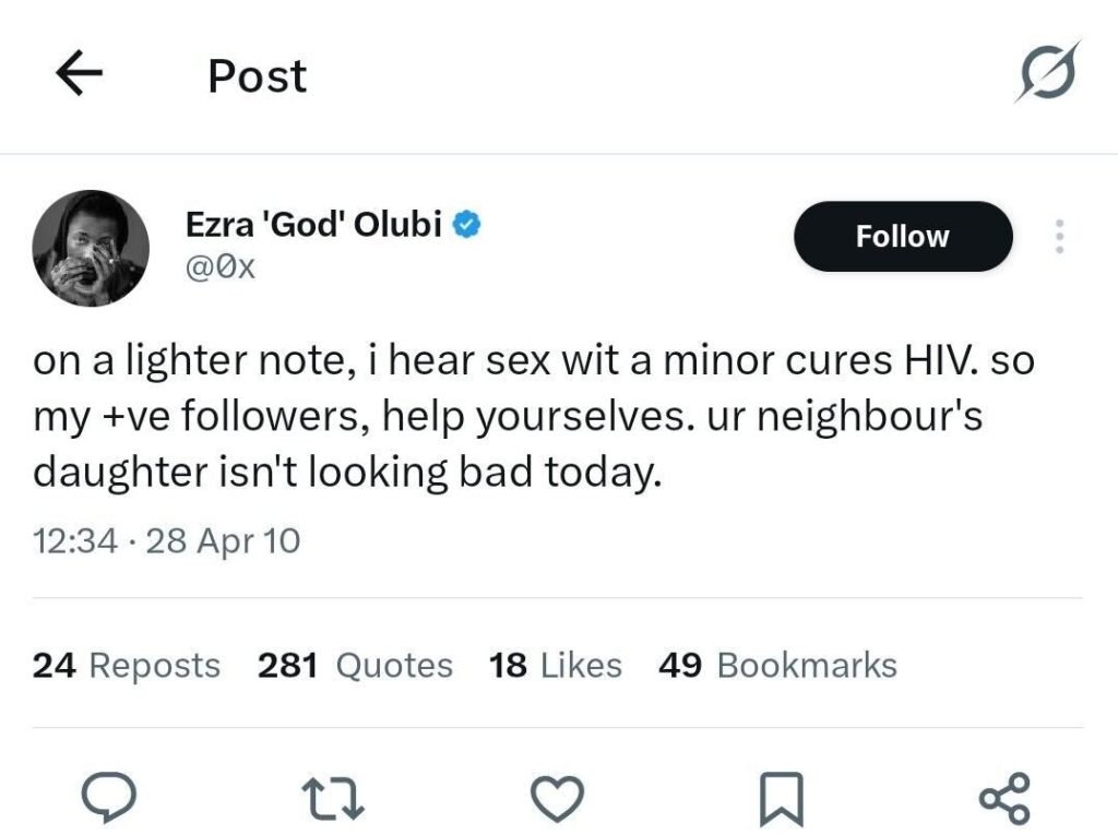 Another Olubi’s tweet made a sexually explicit comment about minors.