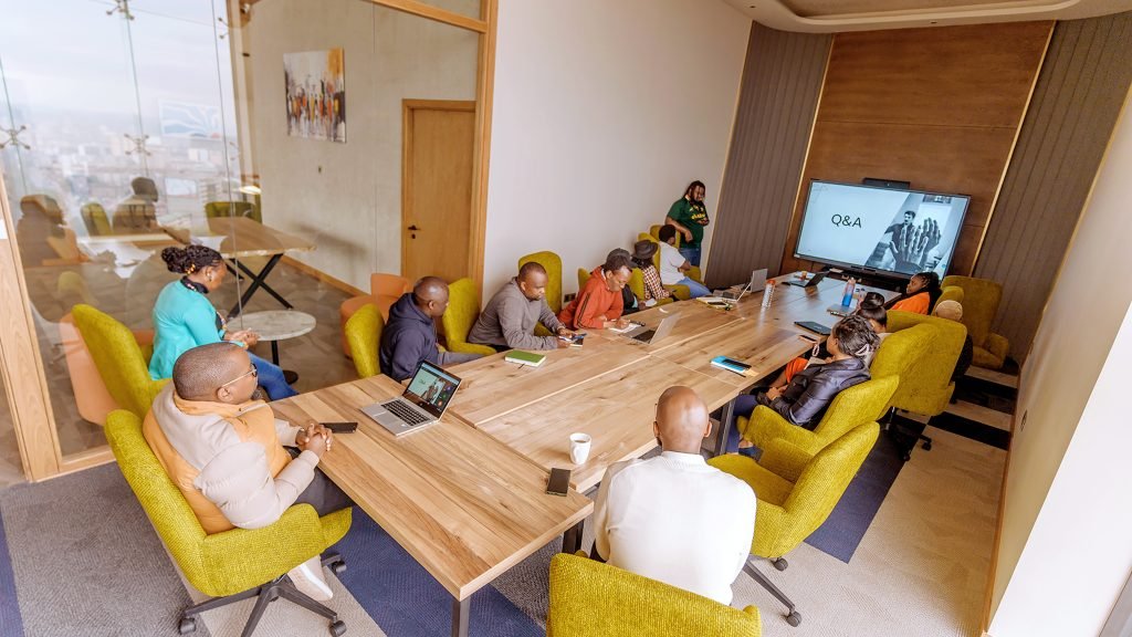 The office stretches along the building with glass on almost every side. From the windows, you can see the city moving slowly below: cars threading through the mid-morning traffic, construction cranes scattered across the skyline, and a faint outline of Ngong Hills in the distance.