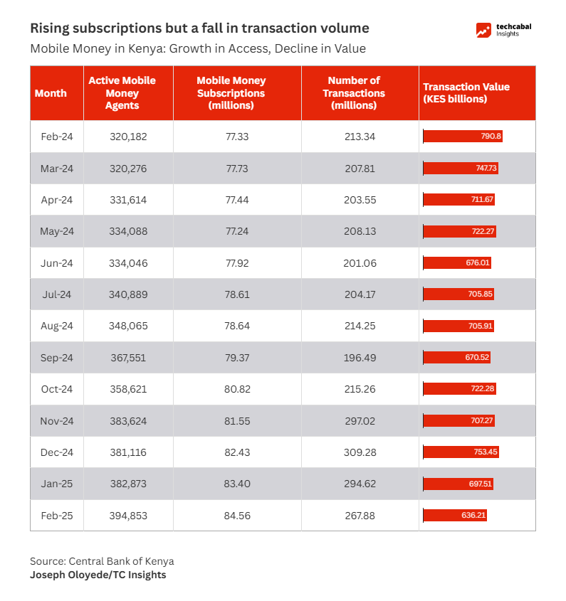 The value of mobile money transactions in Kenya dropped sharply over the 12 months to February 2025, falling by 19.6% from KES 790.8 billion ($6.13 billion) to KES 636.2 billion ($4.93 billion) — the lowest monthly figure recorded in over a year, according to new data from the Central Bank of Kenya (CBK).