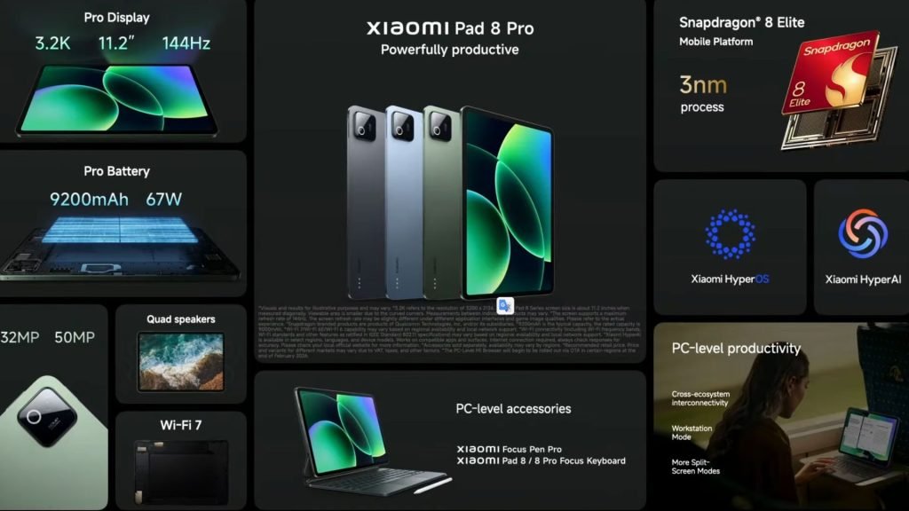 The display is an 11.2-inch 3.2K panel with a 144Hz refresh rate and peak brightness of 800 nits. Xiaomi also introduced a Matte Glass variant that cuts reflections by 44%, a useful touch for anyone who works in bright spaces. Under the hood is a 9,200mAh battery, and the tablet supports the new Focus Pen Pro and Focus Keyboard accessories for a proper productivity setup.