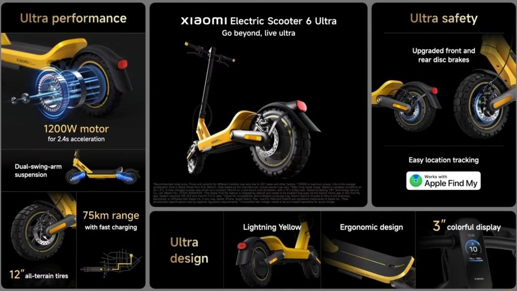 For urban commuters, Xiaomi also announced the Electric Scooter 6 Ultra. It runs on 12-inch tires with a peak motor output of 1,200W and delivers a real-world range of 75km on a single charge. It integrates with HyperOS for seamless route tracking and smartphone connectivity.